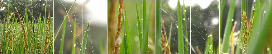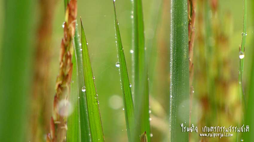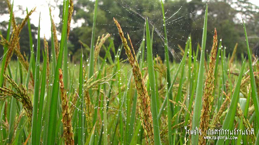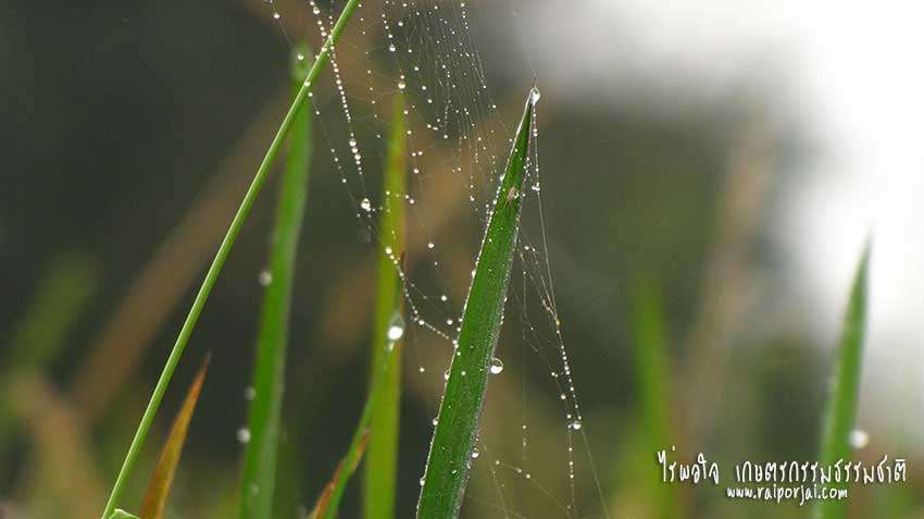 บรรยากาศยามเช้าๆ ปลายฤดูหนาว ท่ามกลางไอหมอก หยดน้ำค้างพร่างพรายบนใบข้าว ต้องแสงตะวันเป็นประกาย รวงข้าวไรซ์เบอรี่ เริ่มชูรวงไสว เหล่าแมงมุมทักทอสายใยระหว่างรวงสู่ใบข้าว เหมือนมันจะรู้ดี สถานที่แห่งนี้ปลอดภัยสำหรับมัน ฉันจะยึดเป็นรังไปตราบชั่วฟ้าดินสลาย |