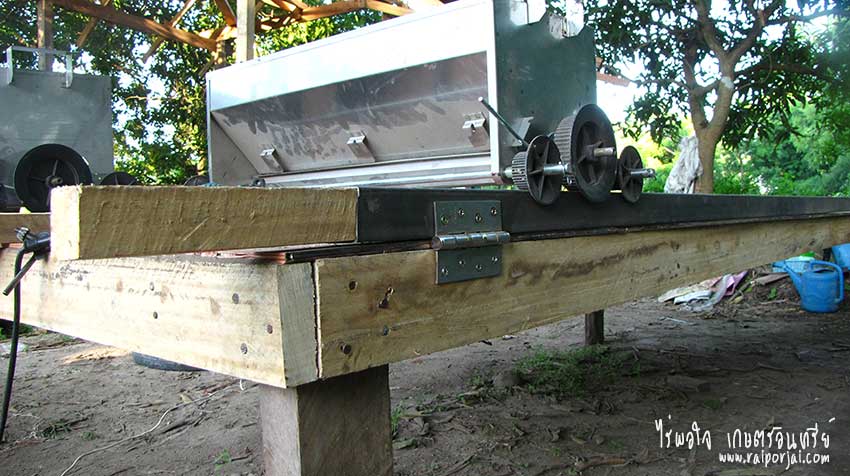 ส่วนรางเลือน 2 ข้างตรงขอบโต๊ะ จะใช้บานพับประตู มายึดไว้ เพื่อให้สามารถพับเข้าพับออกของรางเลื่อนได้ เมื่อทำการโรยดินและโรยเมล็ดข้าวลงในถาดเพาะเรียบร้อยแล้ว จะได้พับรางเหล็กลงด้านข้าง ทำให้สามารถย้ายถาดเพาะกล้าได้ง่าย |