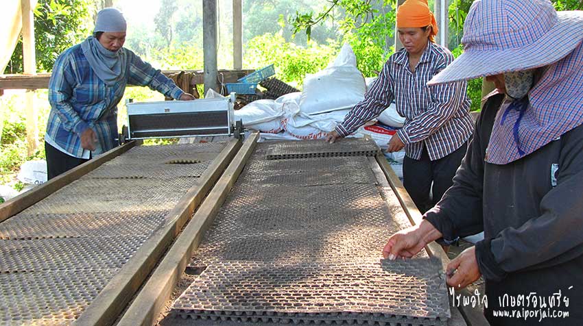 หลังจากใช้โต๊ะเพาะกล้าในถาดหลุมสำหรับนาโยนมากสักพัก ยังรู้สึกว่า งานที่ได้ยังช้าและคุณภาพของงานยังคงขึ้นอยู่กับคนที่ทำการเพาะ ซึ่งความสามารรถที่ทำได้ใน 1 วัน สูงสุดประมาณ 1,000- 1,200 ถาด ในขั้นต่อไป ทางไร่พอใจยังมีแนวทางที่จะพัฒนาให้สามารถเพาะได้ถึงวันละ 2,000 กว่าถาดขึ้นไป โดยต้องใช้วิธีการเพาะแบบอัตโนมัติด้วยเครื่องกล นอกจากจะได้งานเพิ่มขึ้นแล้ว ยังทำให้ประหยัดแรงงานลงไปอีก และที่สำคัญจะทำให้ได้คุณภาพของถาดเพาะที่เท่าเทียมกันทุกถาด คาดว่าคงจะทำสำเร็จในเร็วๆ นี้ครับ |