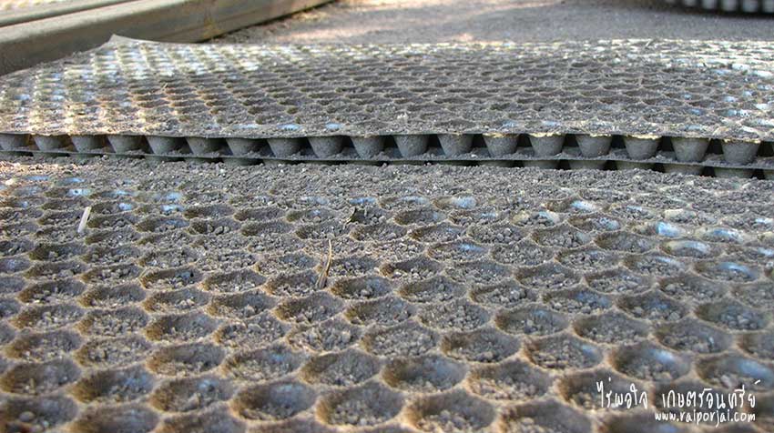 เมื่อโรยข้าวไปเรียบร้อยแล้ว ก็ทำการโรยดินจนเต็มหลุม ซึ่งอาจจะเลื่อนเครื่องโรยดินไป 1-3 รอบ ขึ้นอยู่กับการปรับการลงของดิน ที่สำคัญไม่ควรให้มีดินเพาะล้นพูนที่ปากหลุมมากเกินไป เพราะเมื่อต้นกล้างอกขึ้นมา จะทำให้รากยึดติดกัน และต้นกล้าแต่ละหลุมจะติดกันเป็นกระจุก ทำให้เสียเวลานั่งแยกต้นกล้าแต่ละหลุมออกจากกัน ถ้าไม่ทำการแยกตรงขั้นตอนนี้ เมื่อเอากล้าไปโยน ต้นกล้าจะติดกัน โยนไม่กระจาย รวมกันเป็นกระจุก ทำให้ต้นกล้าเจริญเติบโตได้ไม่ดี |