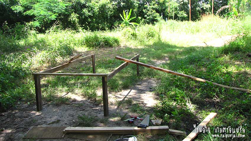 แต่หลังจากทำเสร็จและทดลองใช้งานดู ช่วงห่างระหว่างเครื่องโรย 2 เครื่อง มันแคบเกินไป ทำให้พอมีเครื่องโรยดินวางอยู่บนรางเลื่อน ก็ไม่สามารถเลื่อนเครื่องโรยเมล็ดไปตามรางได้ เพราะจะชนกันเข้า ดังนั้นใครที่จะทำใหม่ให้แก้ไขให้ความกว้างของช่องว่างตรงนี้กว้างขึ้น จากในรูปแบบร่างเลยต้องทำให้ห่างกัน 20 เซนติเมตร ส่วนโต๊ะความยาว 3 เมตร ที่ทำอยู่รู้สึกจะสั้นเกินไป เลยต้องเอาไม้มาต่อรางเลื่อนออกไปอีกข้างละ 30 เซนติเมตร ซึ่งจะวางเครื่องโรยพักไว้ที่ตำแน่งนี้ได้ ส่วนขนาดอื่นๆ ก็เป็นไปตามรูปแบบร่างเลยครับ ปรับแก้ไขได้ตามต้องการ วัสดุของผมใช้ไม้ทำโต๊ะเพื่อความประหยัดและรวดเร็ว ใช้เวลาทำโต๊ะเพียงครึ่งวันก็เสร็จเรียบร้อย |