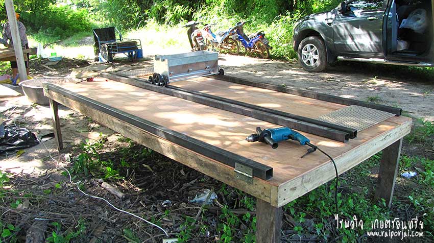 เมื่อทำโต๊ะที่ปูด้วยแผ่นไม้อัดเรียบร้อยแล้ว ให้ใช้สกรูยึดรางเหล็ก 2 ท่อนตรงกลาง ซึ่งทำจากเหล็กกล่องสี่เหลี่ยม ขนาด 1 นิ้ว ให้แน่นหนา อย่าลืมวัดระยะห่างของฐานล้อของเครื่องโรยให้ถูกต้อง และระยะระหว่างเครื่องโรย เพื่อไม่ให้เครื่องโรยชนกันในขณะที่ทำงานเลื่อนไปบนรางพร้อมๆ กัน |